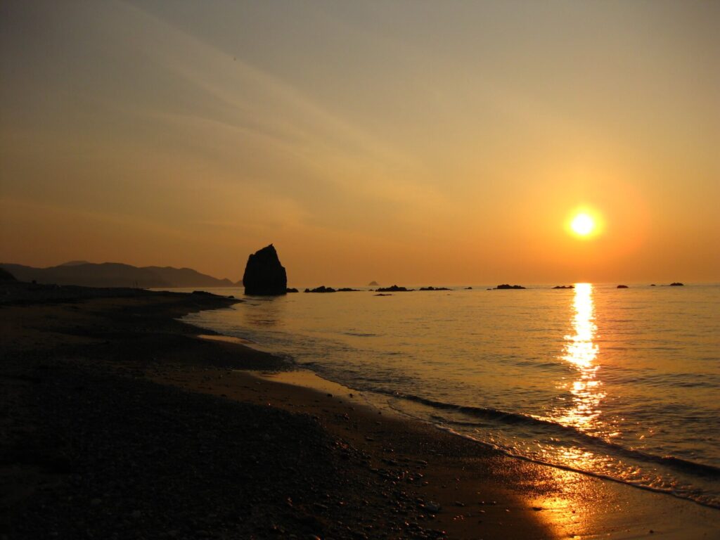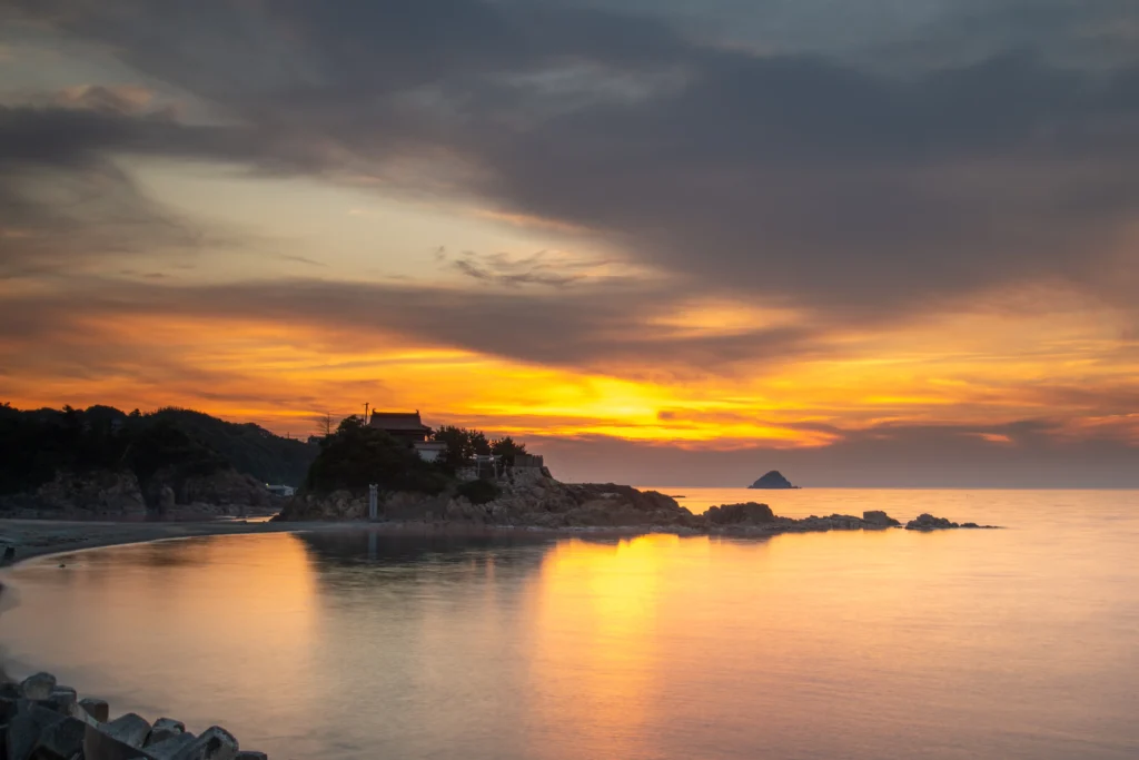 さらに、海側へ向かえば持石海岸が広がり、夕暮れ時には水平線に沈む太陽が作り出すオレンジ色のグラデーションが絶景です。