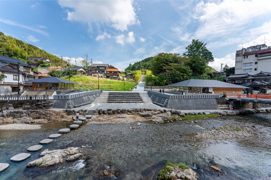 温泉街の中心を流れる音信川の両岸には、誰でも自由に座れる「川床テラス」が設置されています。川のせせらぎをBGMに、テイクアウトした飲み物を片手に読書をしたり、友人と語らったりなど自由な時間を過ごせます。