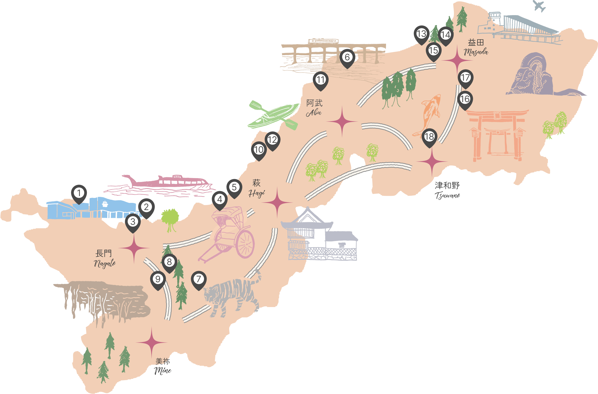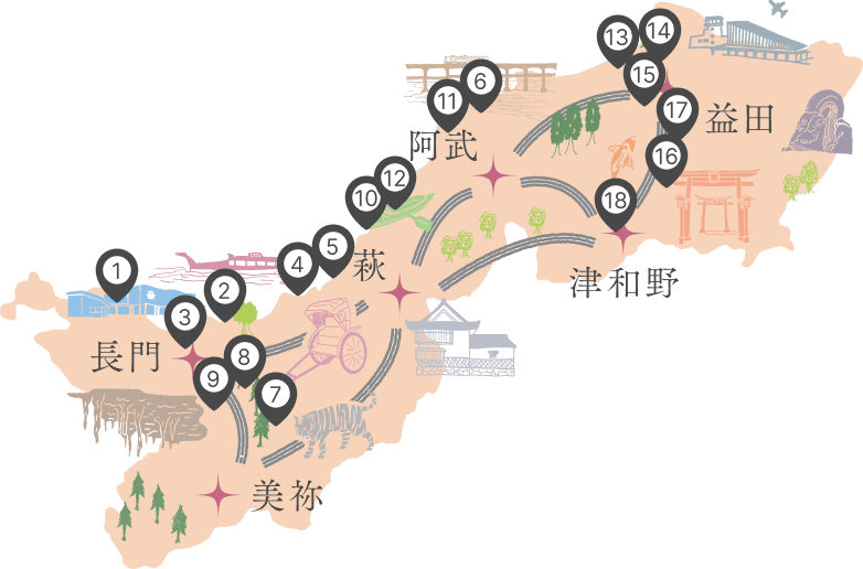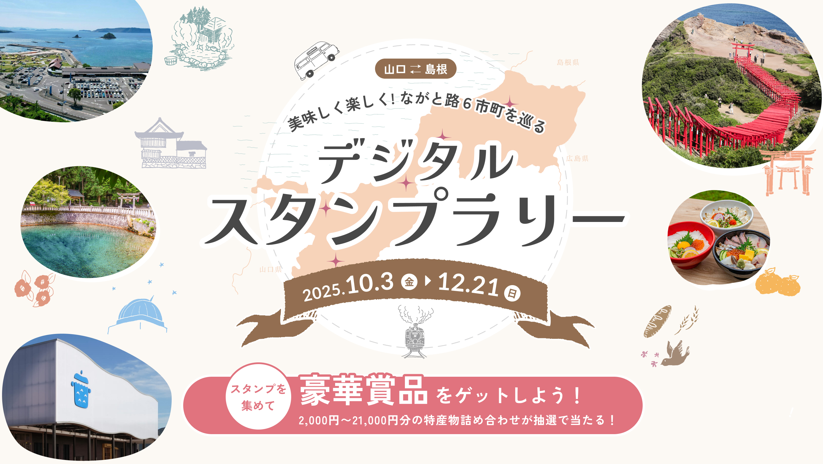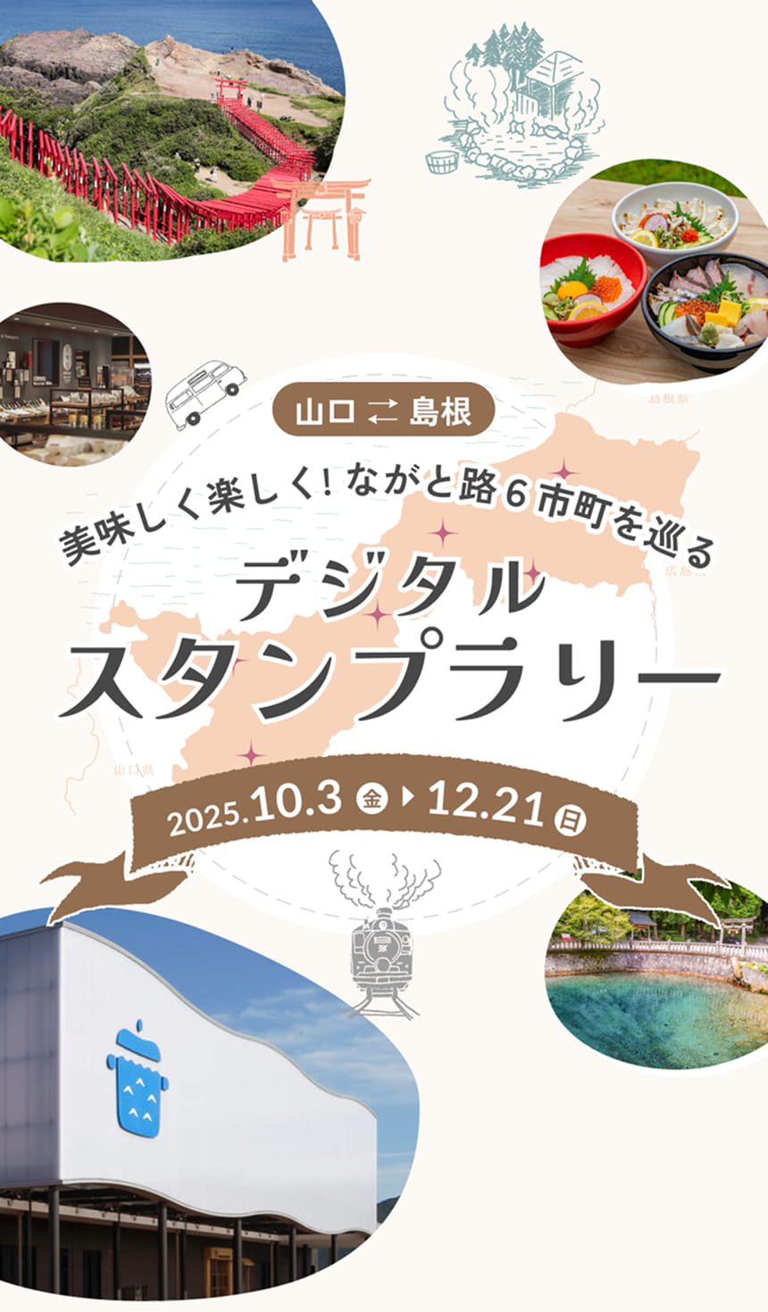 島根県西部から山口県北部に位置する「ながと路」。美しい自然、豊富な海と山の幸、そしてロマン溢れる歴史と文化がぎゅっと詰まった6市町をデジタルスタンプラリーアプリで美味しく、楽しく周遊しよう!